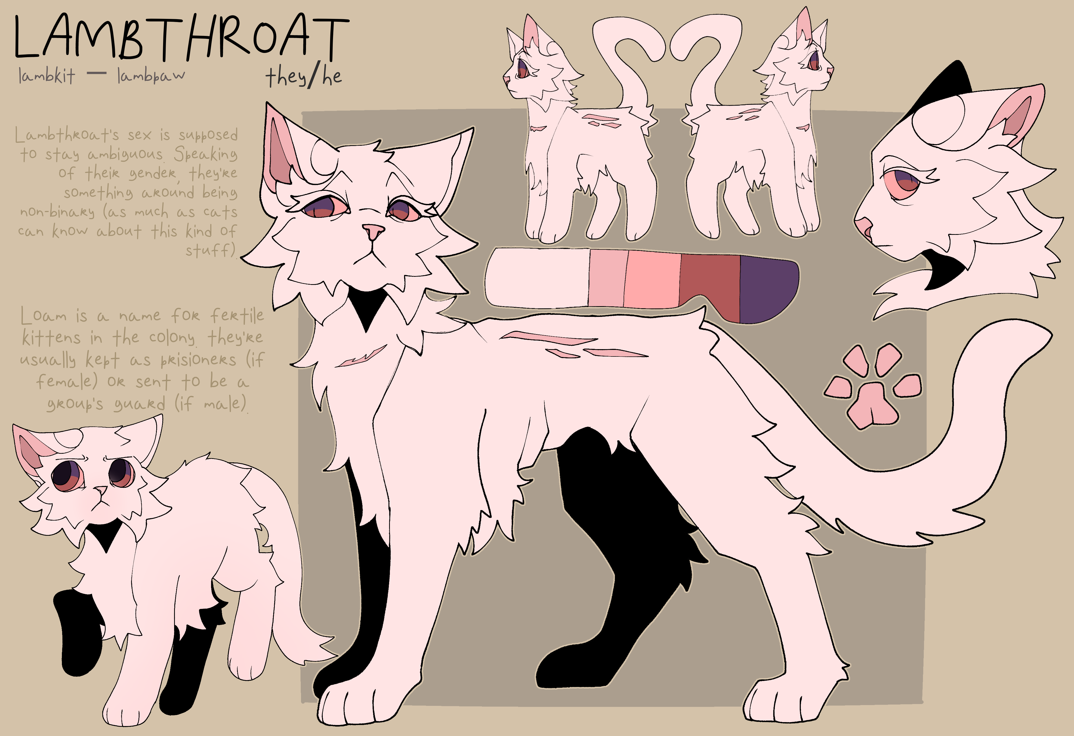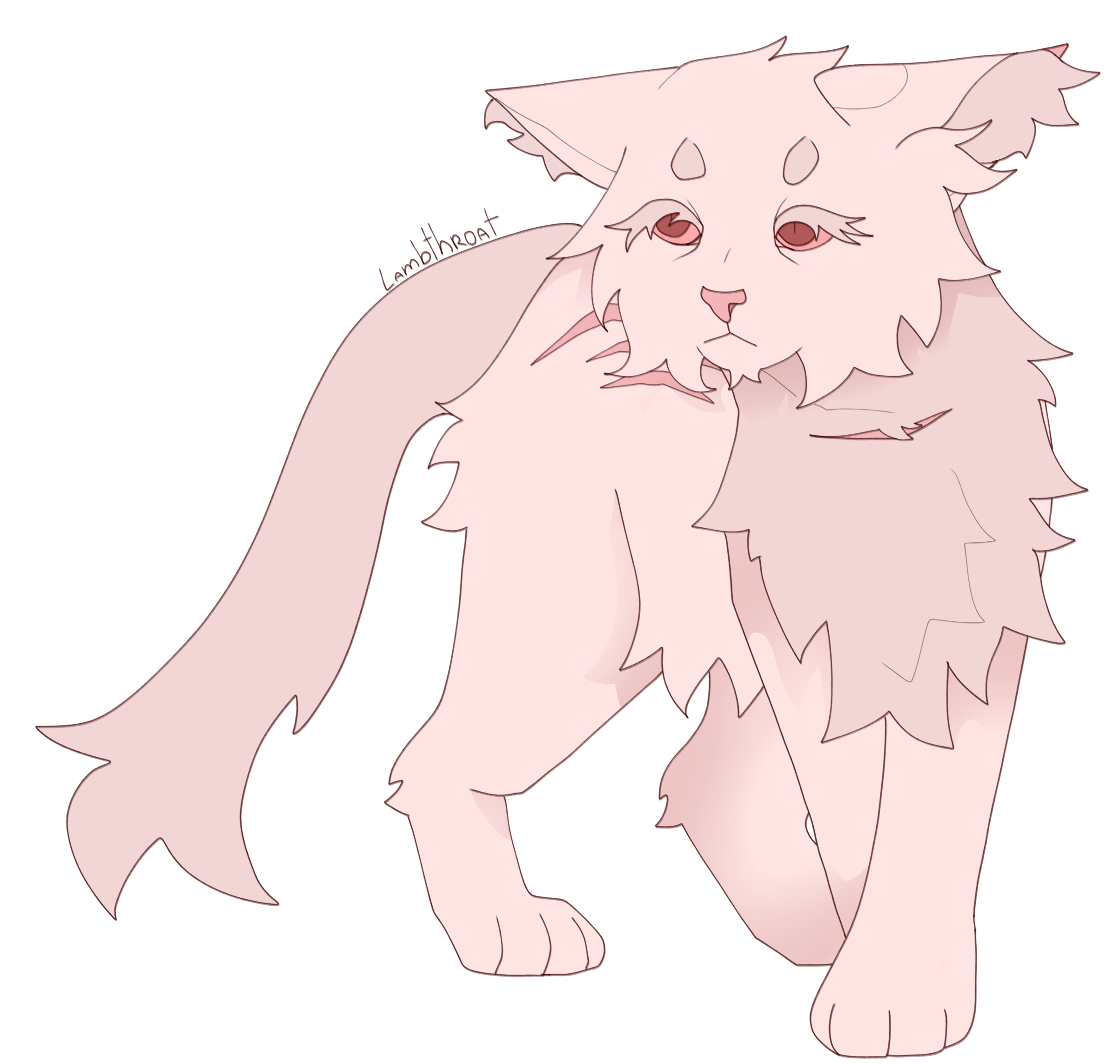 Lambthroat is a slender, long-legged snow-white albino cat with scarlet eyes. They have a small scar on their neck, as well as two long ones running along their flanks. They are leader of the Roots and former prisoner of the Cloudchasers. Born as a loam in the prisoner camp, they survived through a combination of luck, ferocity, and an unshakeable will to live. Their bond with Crowmuzzle shaped their early life, and their vision at the willow ravine shaped everything after.